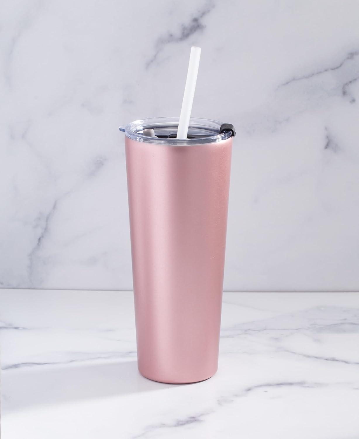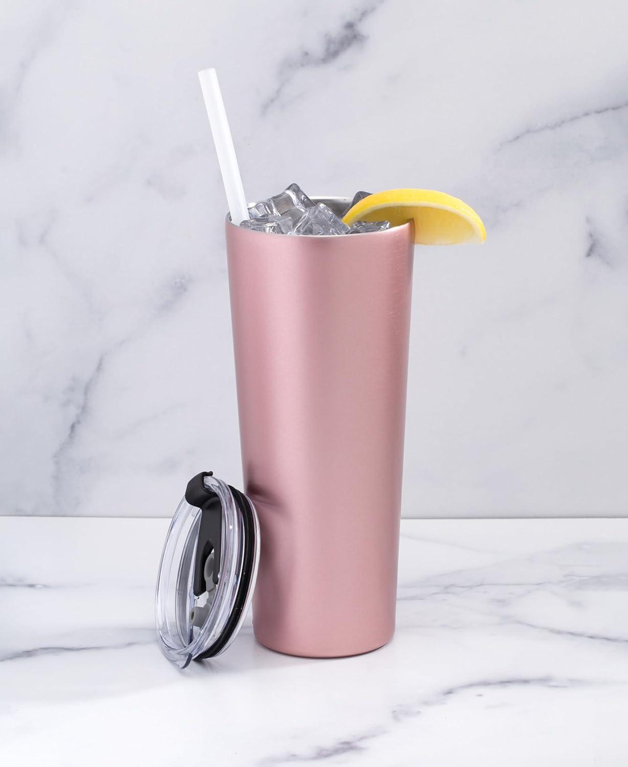 Cheers to this stainless steel, insulated tumbler. Designed to hold 24 ounces of your favorite beverage, from piping hot coffees to chilled iced teas, all while featuring a stylish finish. Comes complete with a spill-proof lid and straw, making it perfect for indoors, outdoors, or on-the-go!