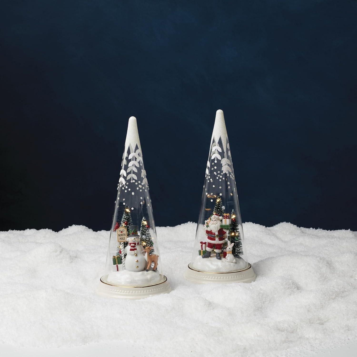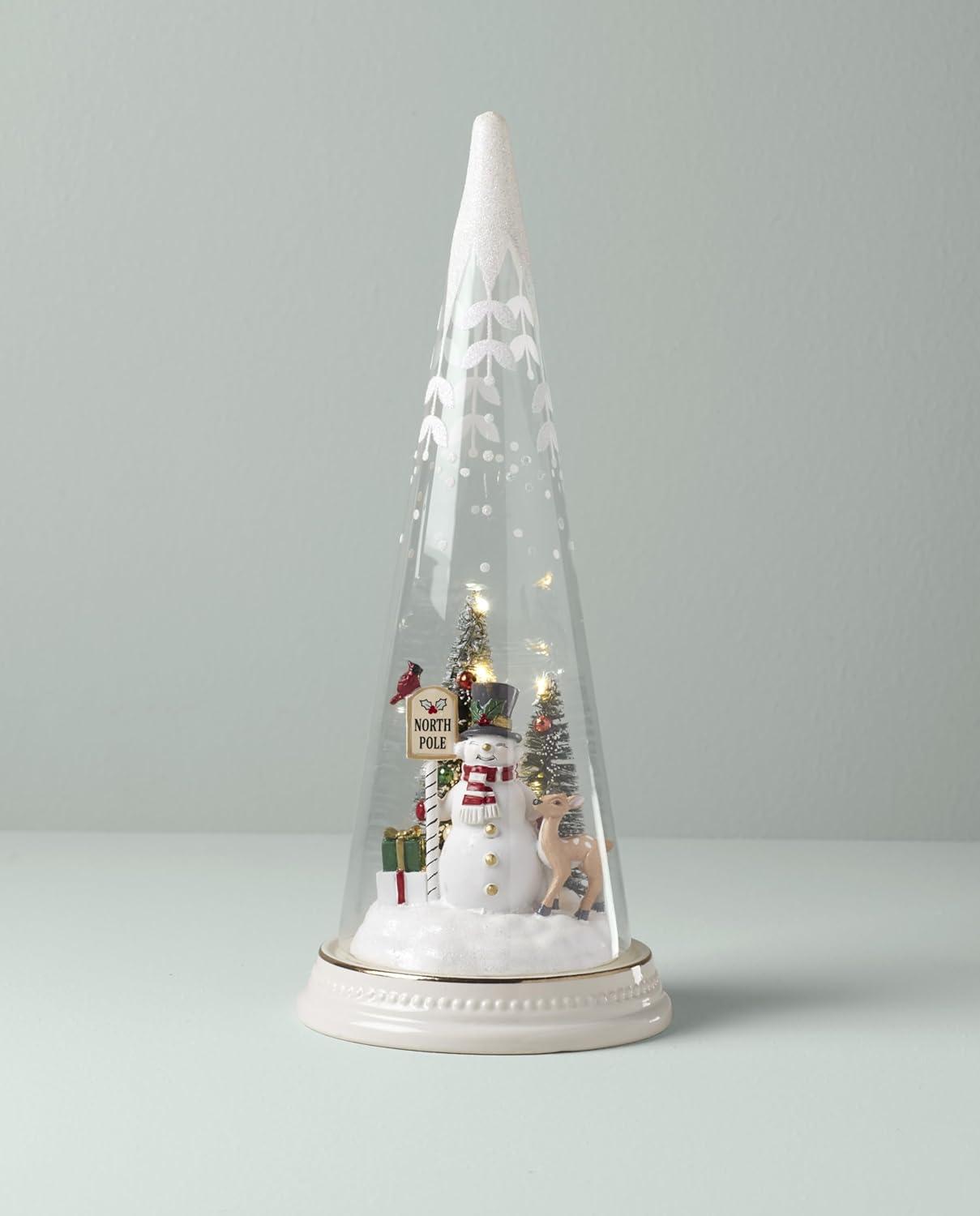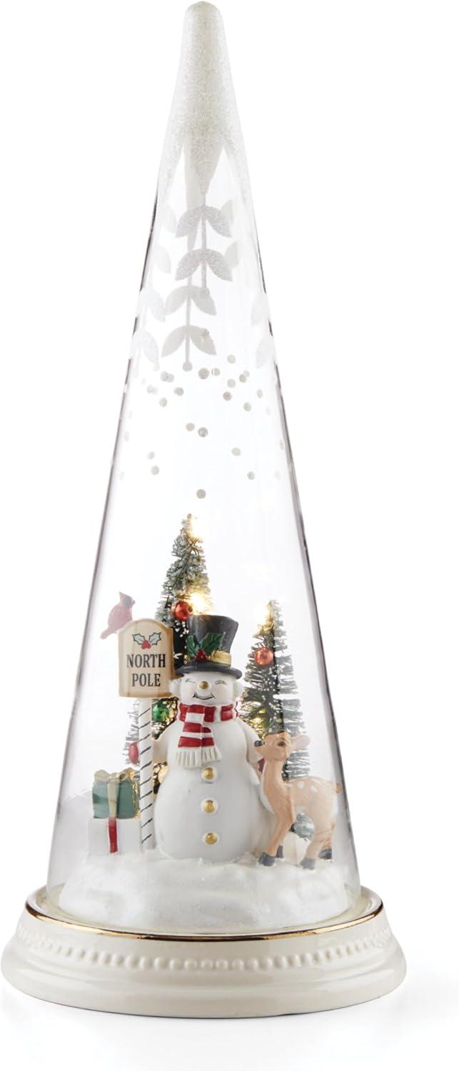 Reserve a spot on your mantel for this merry and magical lit seasonal scene. A picturesque snowman stands inside a snow-detailed glass encasement, festively presenting a wholesome holiday motif. With its clever cone shape, this piece looks stunning standalone or tucked alongside complementary Christmas tree figurines.